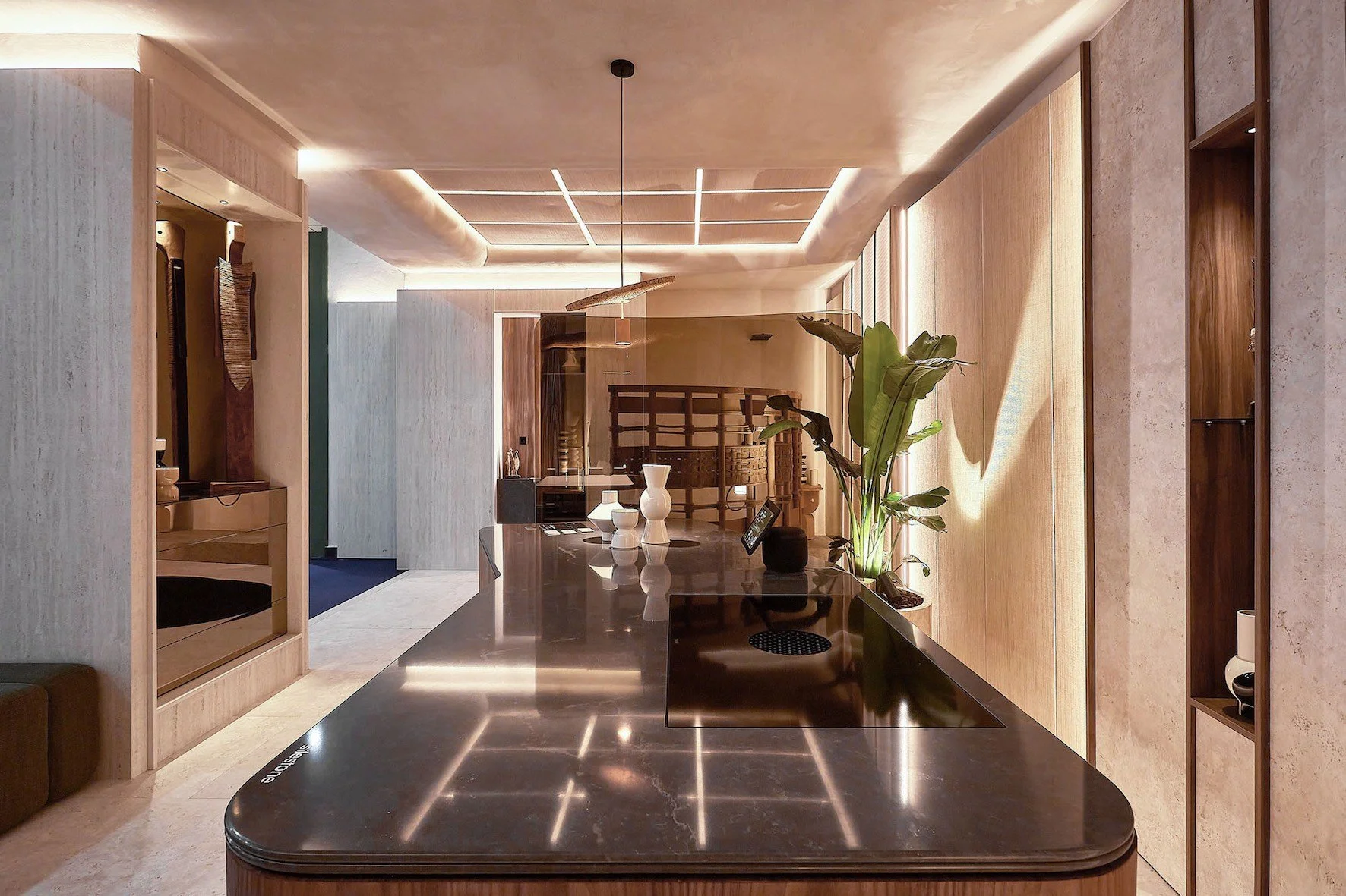 El espacio, Stand C-14, que pivota sobre un ambiente de cocina como gran protagonista, se convierte en un refugio donde naturaleza y tecnología conviven en armonía gracias a sus formas suaves y asimétricas, una iluminación que invita a la contemplación, y a materiales naturales y duraderos como la cuarcita que presenta Cosentino: el color Itara de su marca de piedras naturales protegidas Sensa. Una espectacular cuarcita brasileña Verde Esmeralda aliada perfecta para el diseño de cualquier ambiente exclusivo de cocina o baño.