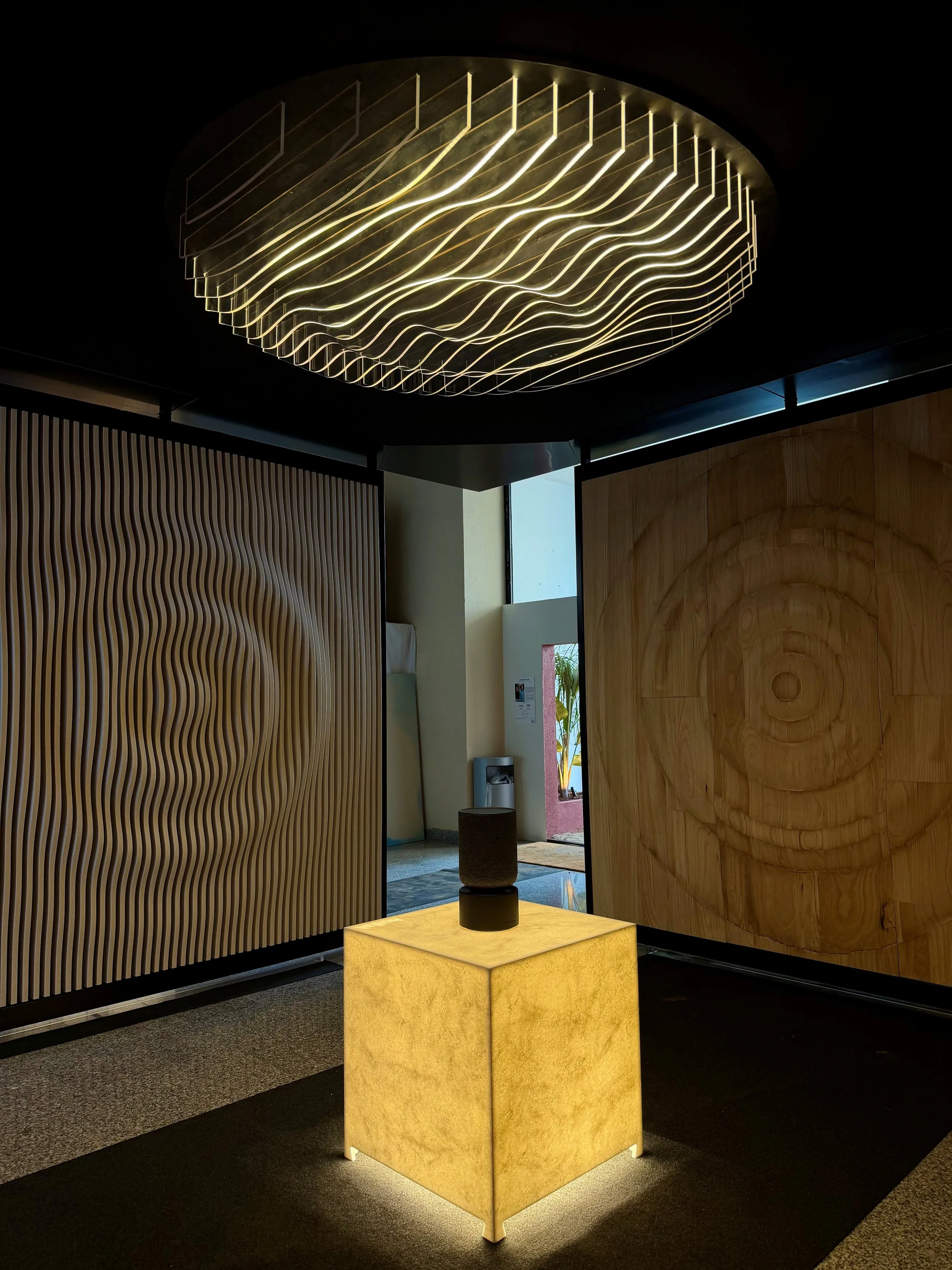 La luz ocupa un papel central en el espacio: una lámpara de acrílico recrea el efecto de la gota mediante iluminación programada, generando una atmósfera envolvente que refuerza la identidad del conjunto. Diseño, fabricación y tecnología se integran así en una propuesta coherente y singular.