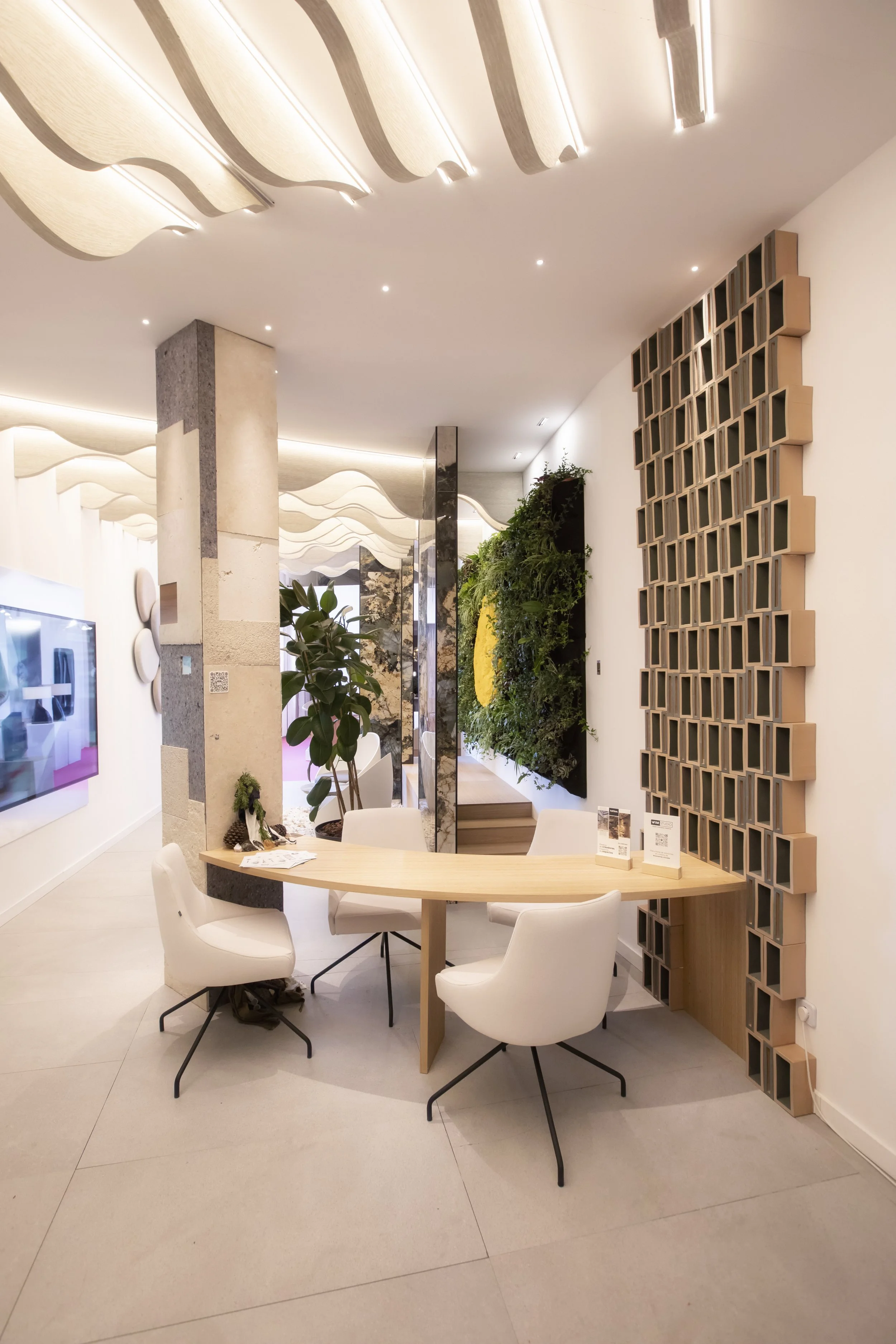 Se identifican 3 zonas, al acceder nos encontramos con un espacio natural, enmarcado mediante una tarima que nos lleva a atravesar el jardín vertical que hace a su vez de podio para esculturas y unifica mediante los pilates de madera con formas orgánicas realizando un juego con los paneles acústicos del techo. Encontramos aquí un pequeño estar, zona de relax. Luego contamos con un espacio de trabajo donde el nodo central, punto que da vida al lugar y a partir del cual se desarrolla el espacio, se une con un escritorio de roble natural con butacas tapizadas de que nos brindan mucho confort, y separándonos virtualmente de la zona propuesta con la instalación audiovisual donde las reuniones pueden darse de una manera distendida, contando con un sofá de tattoo CREATORS, acompañado de una mesa de centro obtenida a través de materiales reciclados de los propios partners de este espacio diseñada y fabricada por WIM Studio, y por último pero no menos importante un mueble bar de piedra y metal, también de tattoo CREATORS.