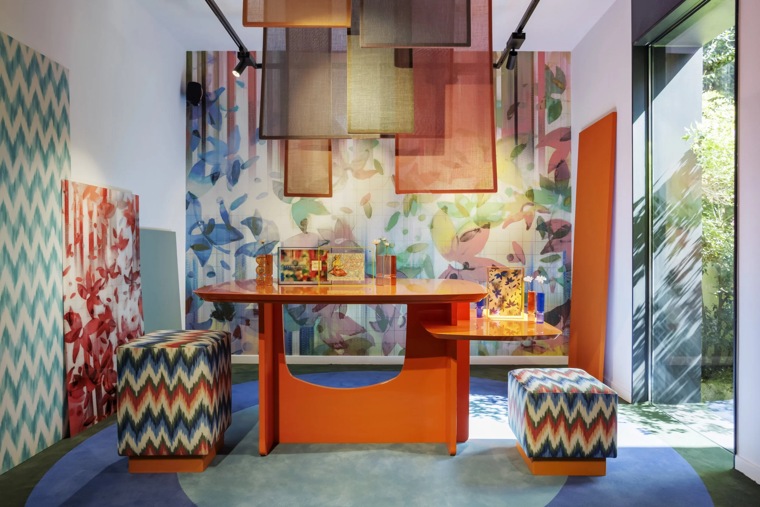 En el espacio que Gancedo cede temporalmente a interioristas y arquitectos, conviven las formas redondeadas y las cuadrangulares; una alfombra de círculos concéntricos en tonos verdes y azules intensos da la bienvenida, y se complementa con los acabados semi redondeados de la mesa: una pieza de doble altura, fabricada por La ebanistería, y diseñada por el estudio. Esta pieza lacada en un color naranja brillante, es el eje central del proyecto, acompañada por dos pufs también en dos alturas, tapizados con tejidos de la colección Formentor.